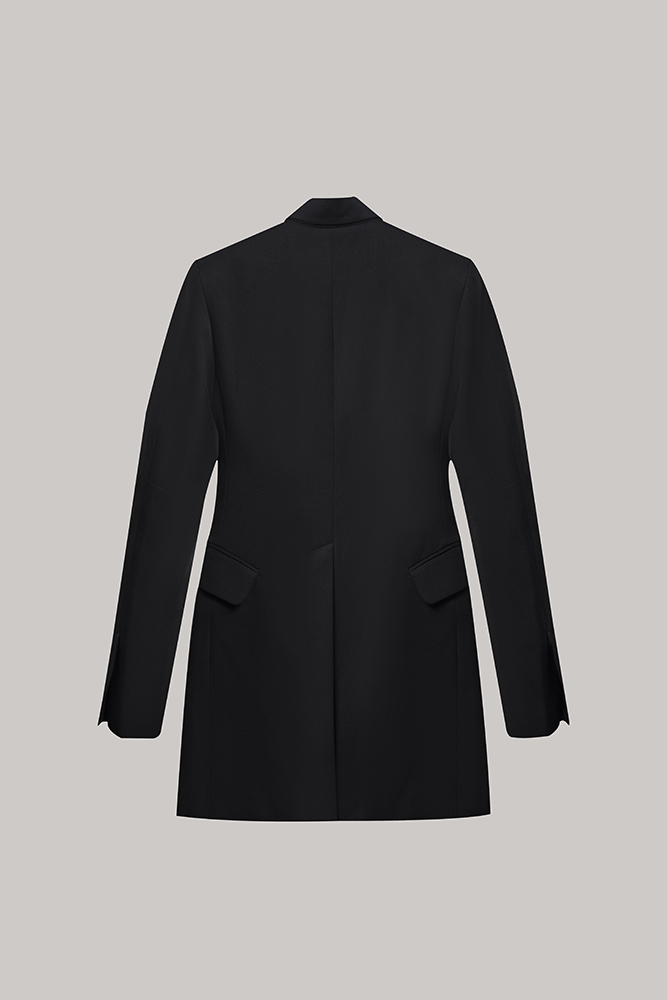 The sharp lapel detail adds a couture-inspired touch, balancing strength and elegance in one refined piece. Finished in a timeless black tone, this blazer coat transitions effortlessly from formal settings to elevated everyday wear. Wear it as a statement outer layer or style it as a dress-like blazer for a bold, confident look.