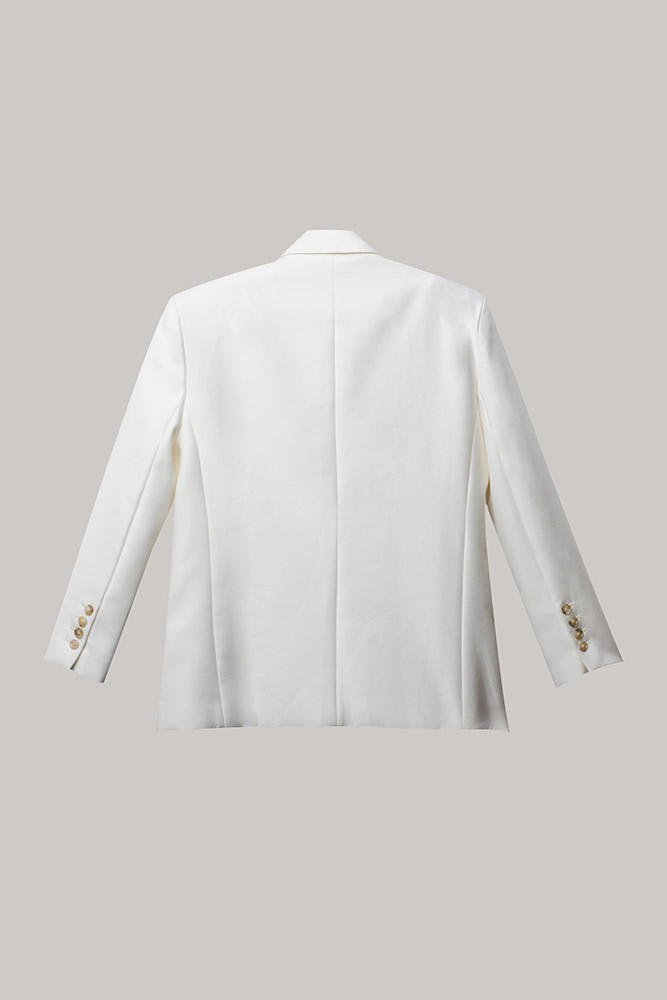Designed with a classic peak lapel and double-button front, the blazer offers a refined silhouette that enhances the shoulders while maintaining a balanced, flattering fit. Subtle waist shaping and neatly finished pockets add depth and structure without overwhelming the design.