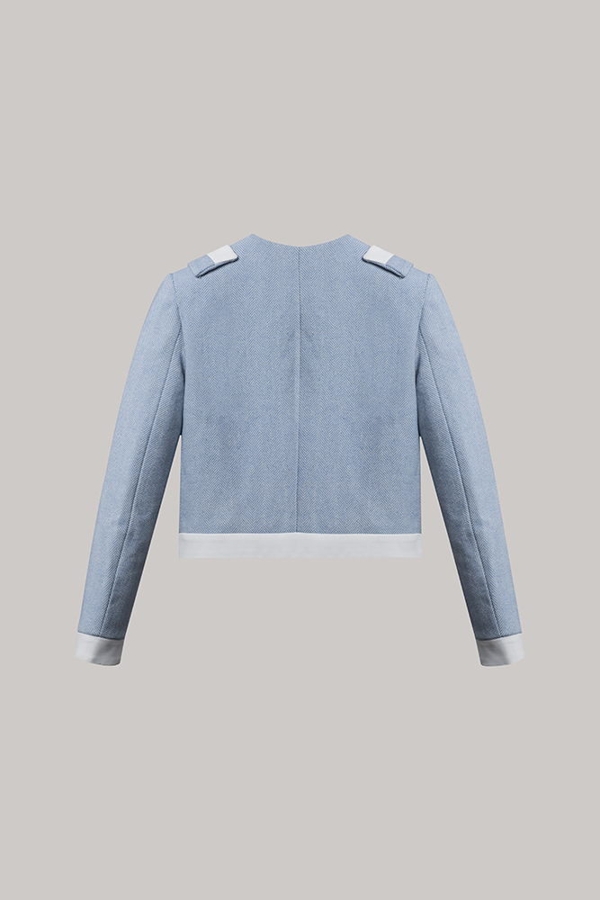Crafted in a soft powder blue tone, this piece features decorative button accents and tailored paneling that create a polished yet youthful silhouette.